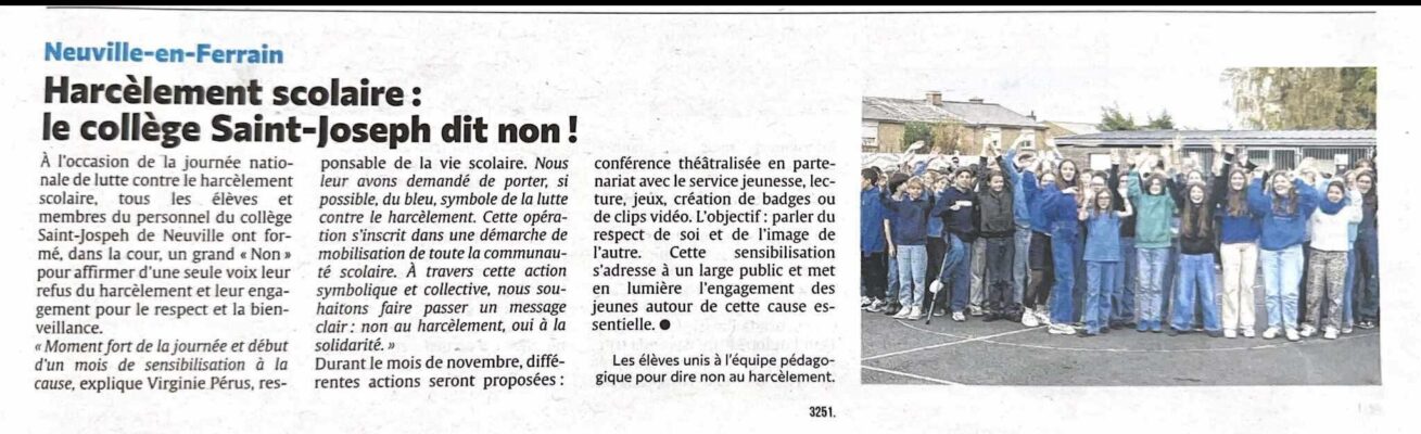 A l’occasion de la journée nationale de lutte contre le harcèlement scolaire, le collège Saint Joseph se mobilise. Tous les élèves et membres du personnel du collège se sont vêtus de bleu, couleur symbole de la lutte contre le harcèlement. Moment fort de cette journée : la formation d’un grand “NON” humain dans la cour du collège, réalisé […]