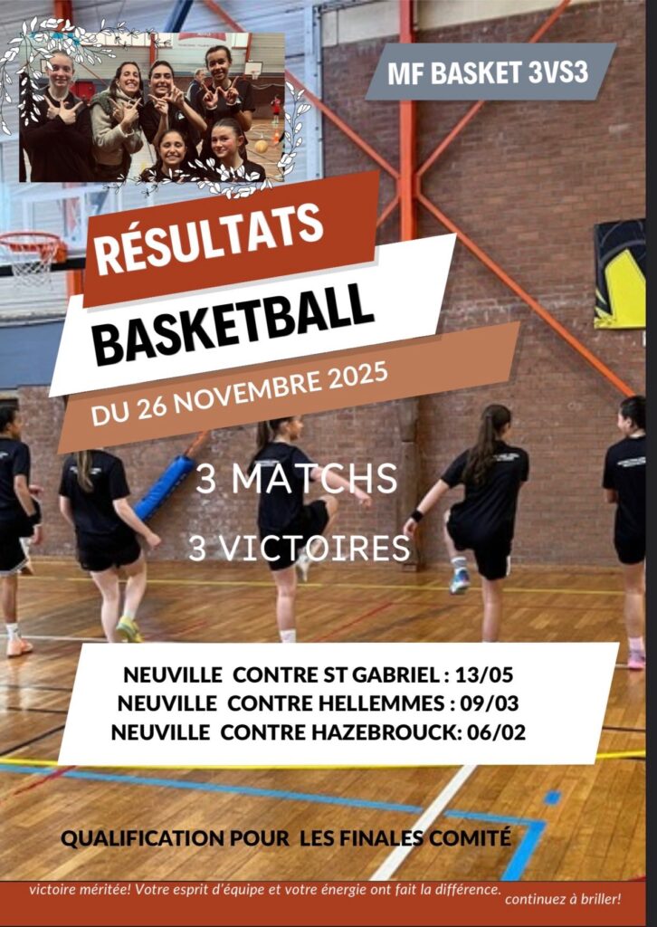Mercredi 26 novembre fut une nouvelle fois sportif. En basket, les minimes filles se délaçaient à Tourcoing pour le tournoi du district 3 vs 3. Elles remportent leur 3 matchs et se qualifient pour les finales du Comité. Nous les retrouverons le 11 février 2026 à Bourbourg. Bravo les filles sans oublier la coach !