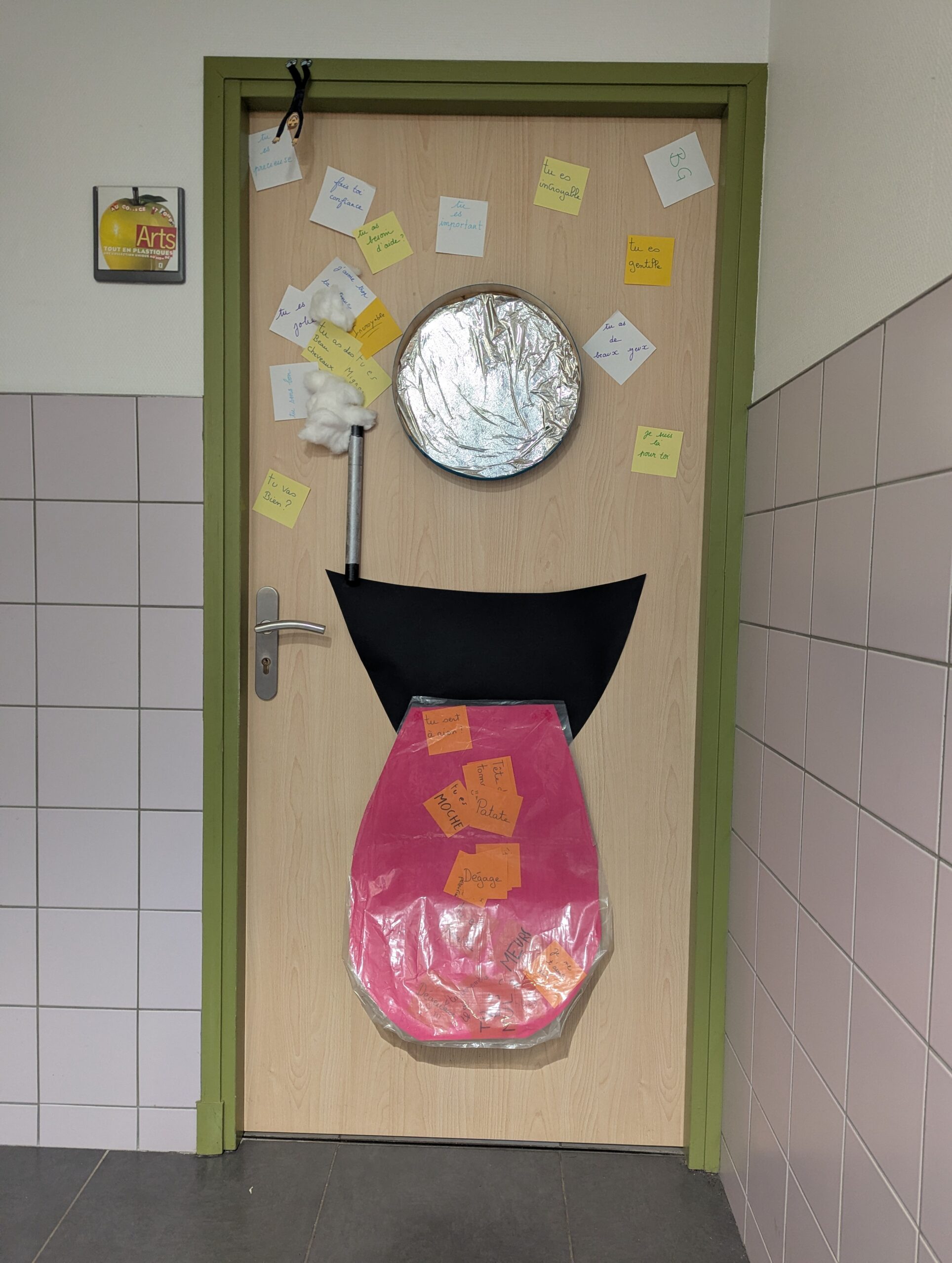 Sur le temps du midi et dans le cadre du mois de lutte contre le harcèlement amorcé en novembre, les élèves qui le souhaitaient ont participé à un concours. L'idée était de répondre à cette idée : une porte contre le harcèlement. Les élèves ont fait le choix de représenter une bouche qui dit des mots méchants, les déverse dans un sac comme dans une poubelle. Ces mots ont la possibilité de remonter la porte pour passer dans une sorte de conduit qui les transforme en mots bienveillants. Au centre, une sorte de miroir (en aluminium pour des raisons de sécurité) qui a pour idée de nous proposer de nous regarder..